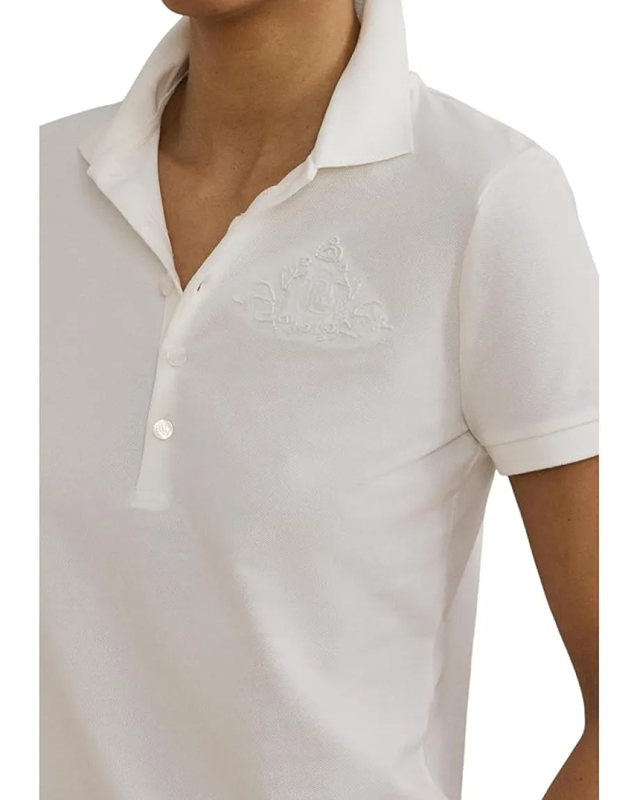 - Synonymous with Lauren Ralph Lauren® style, this version of the stretch-cotton piqué Polo shirt is decorated with a tonal floral logo beaded and embroidered at the chest. Designed in a slim fit that hits at the hip, this Floral-Logo Cottonpiqué Polo Shirt features a classic rib-knit Polo collar and a five-button placket finished with LRL-engraved pearlised buttons. Short sleeves with rib-knit armbands offer a polished touch, while side-split hems add ease of movement. The beaded and embroidered floral motif paired with the signature LRL logo at the chest brings a refined and feminine finish to this timeless wardrobe staple.