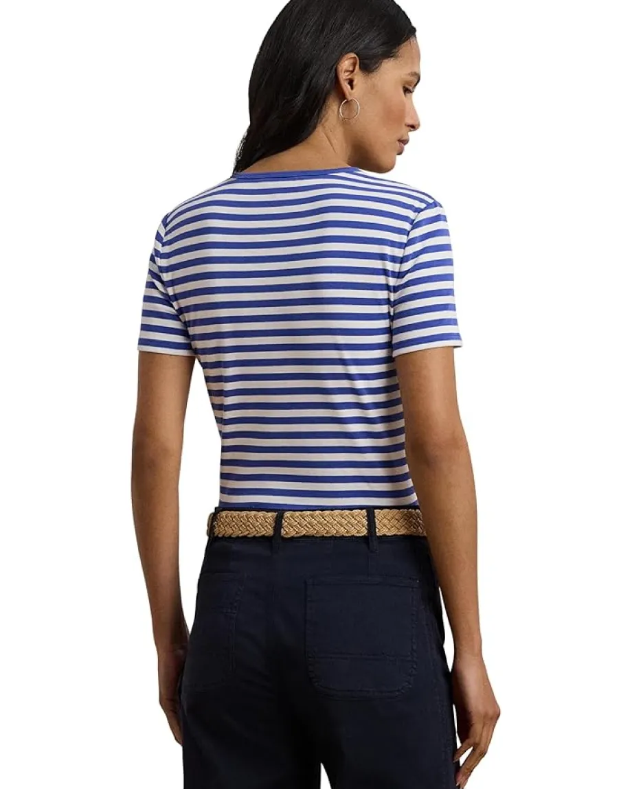 - Adore your casual yet flattering look by donning the LAUREN Ralph Lauren® Striped Stretch Cotton Crewneck Tee with any denim jeans or shorts. This pull-on style tee is made with lightweight stretch cotton for luxurious comfort and features a crew neck, short sleeves, straight hem, and an “LRL”-embroidered logo at the hem adds a signature finish. The tee comes yarn-dyed with timeless horizontal stripes for elevated style and is intended to hit at the hip.