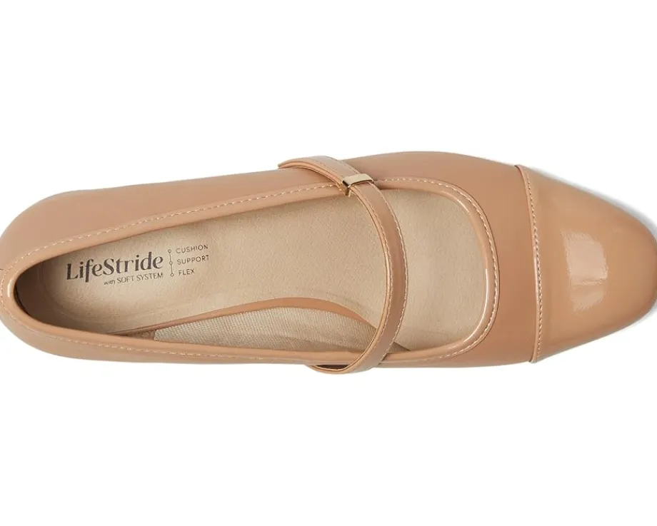 - Now trending, always classic-the LifeStride® Brooke is the perfect blend of sophistication and comfort. This reimagined Mary Jane heel features a sleek polyester upper with a chic patent toe cap and adjustable strap detail, giving you a polished look for work, weekends, and beyond. Designed for effortless wear, the pull-on fit and cupped heel provide a secure feel, while the Soft System® comfort technology delivers shock absorption, superior cushioning, and lasting support. The EVA insole ensures a plush step, and the synthetic rubber outsole with enhanced traction keeps you steady. A block heel adds the perfect touch of elegance, making every stride confident and comfortable. Plus, with partially recycled synthetic rubber linings, it’s a choice you can feel good about.
