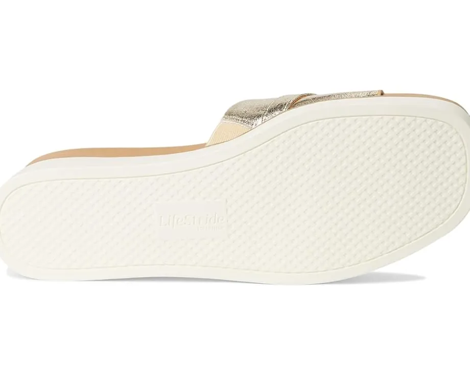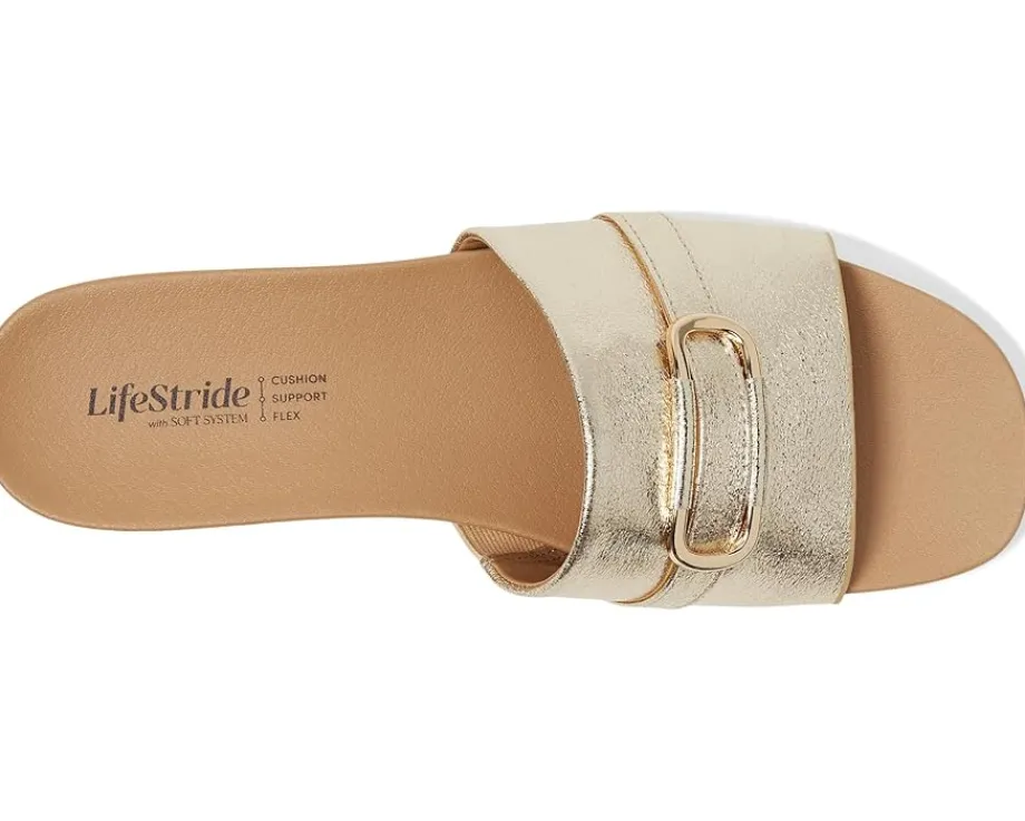 - Effortless chic, redefined: LifeStride® Genevieve effortlessly blends casual comfort with refined style. These chic slide sandals are designed with faux leather or woven fabric, a soft square open toe, and a slip-on fit that makes getting ready a breeze. The metallic ornament detail adds just the right touch of glam to elevate any outfit, from laid-back weekends to evening strolls. Crafted with Soft System® comfort technology, the foam insole and synthetic rubber outsole provide unbeatable cushion, support, and flexibility. The traction sole ensures stability with every step, while the partially recycled linings offer eco-friendly appeal. These slides are the perfect blend of fashion and function, ready to complete your closet essentials.