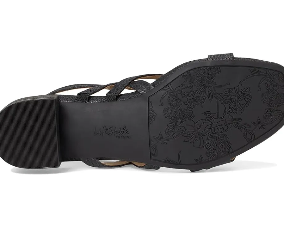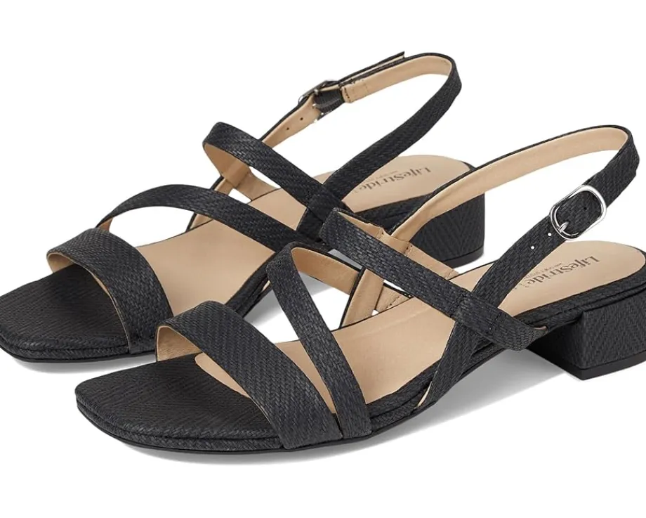 - Effortless chic, all day long: The LifeStride® Janet strappy sandals are the perfect combination of style and comfort. Featuring a sleek polyester upper and modern open square toe, these sandals boast chic strappy detailing and an adjustable buckle strap closure with built-in stretch for a customized fit. The slingback design adds a touch of sophistication, while partially recycled PU linings showcase an eco-friendly edge. Engineered with trusted Soft System® comfort technology, enjoy superior cushioning, support, and flexibility, complemented by a foam insole and full-length cushioned footbed for heel-to-toe bliss. A durable synthetic rubber outsole ensures reliable traction and stability for every stride.