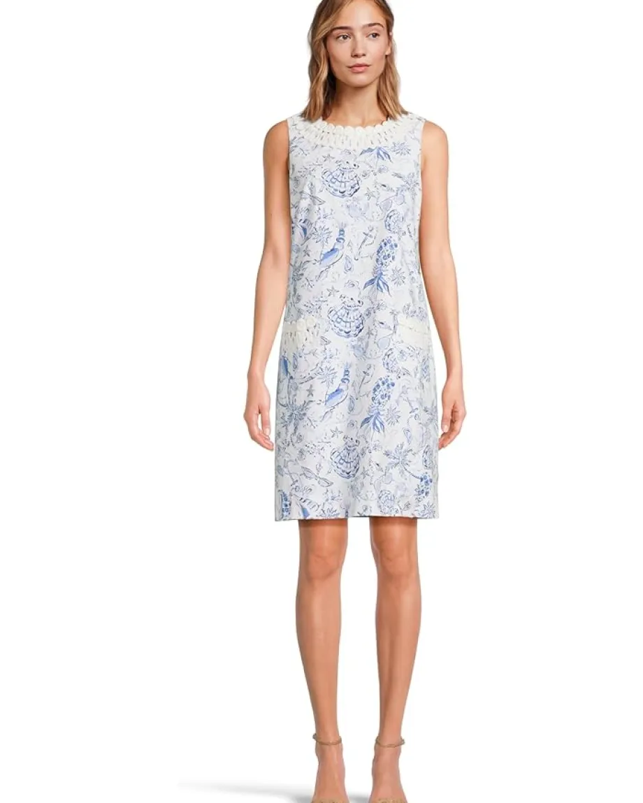 - Exude a subtle yet fashionable look wearing the pull-on style Lilly® Pulitzer Anabelle Stretch Shift Dress. The bra-friendly shift dress with side panels features a crew neck, a sleeveless design, a back zipper closure, pleats at the front hem, and a knee-length silhouette with a Lilly lace trim. The patch pockets on the front offer storage for small essentials while the allover floral print adds an exquisite touch.