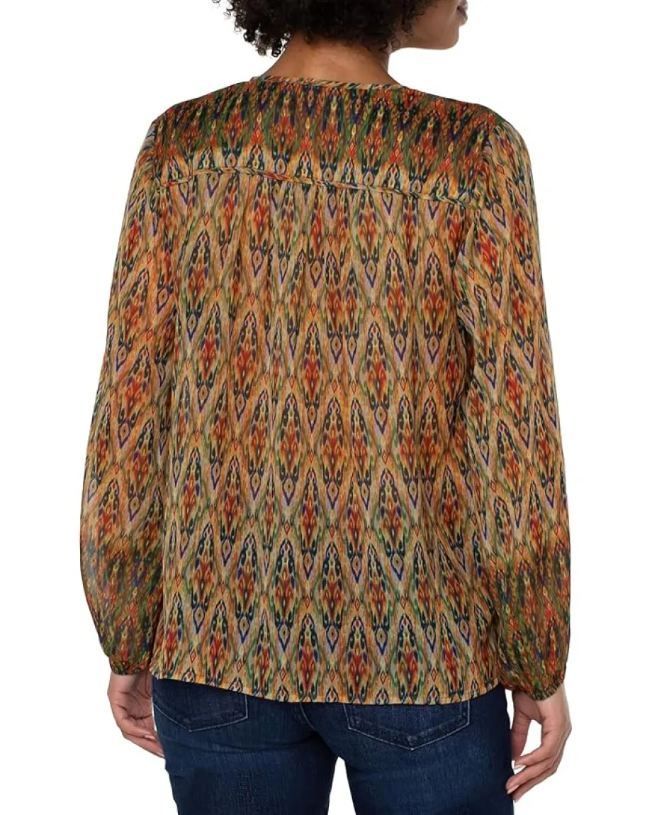 - Acquire the exquisite blend of fashionable and comfort look wearing Liverpoolâ„¢ Long Sleeve Double Layer Tie Front Woven Blouse. It features split neckline with tie detailing on the front, straight hemline, and allover iconic print.