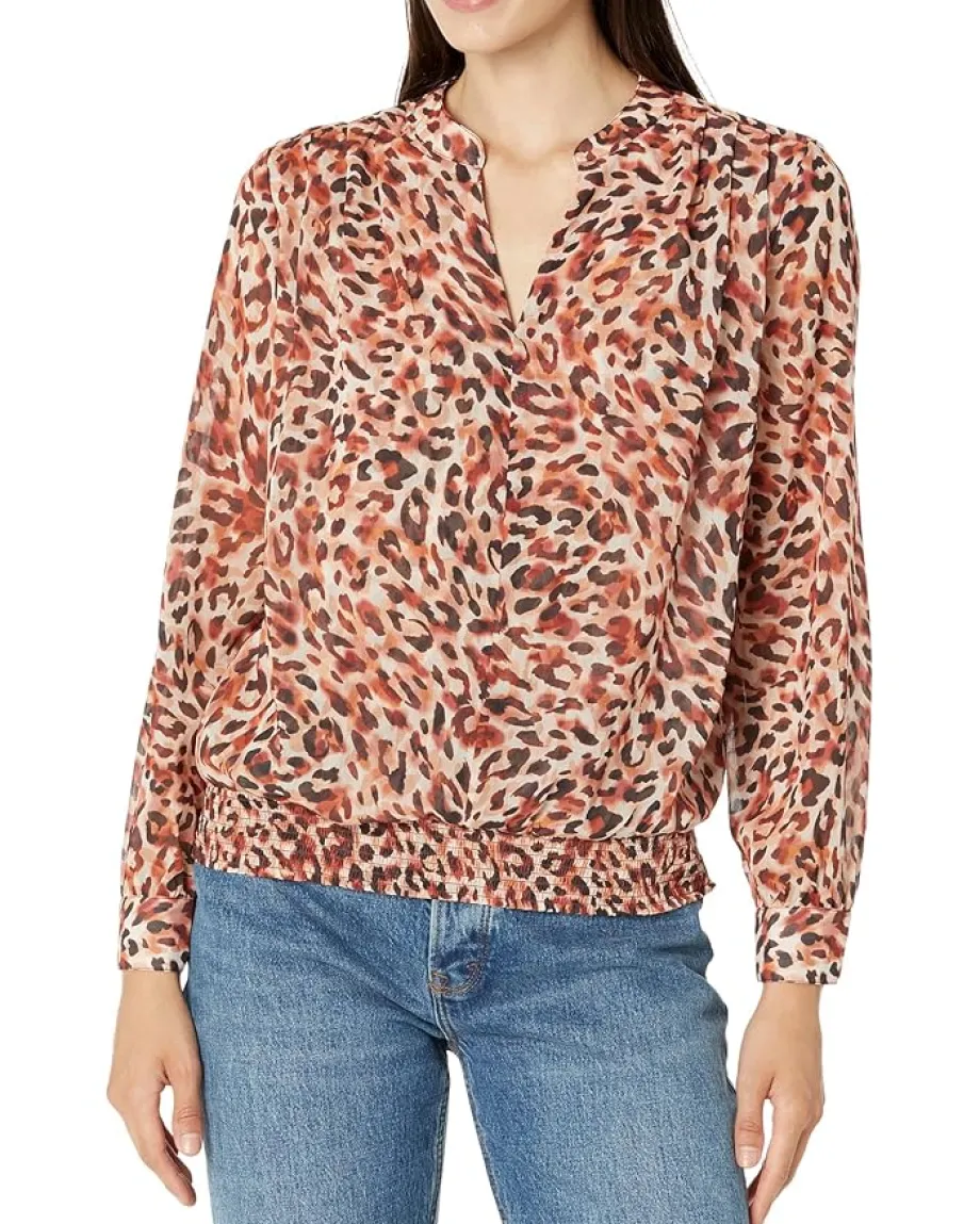 - Amp up your everyday look by wearing the Liverpoolâ„¢ Long Sleeve Woven Blouse with Smocked Waistband. The pull-on style top has a V-neckline, long sleeves with cuffs, and an elasticated hem for a classy look. The intricate print allover makes it a stand out addition to your closet.