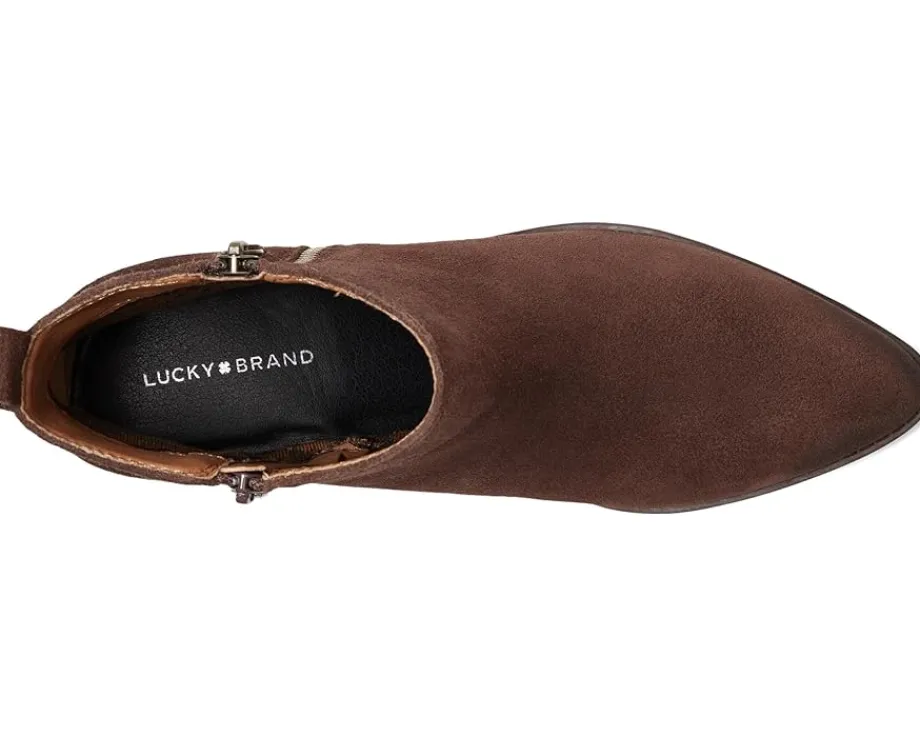 - The Ailein boot from Lucky Brand® is an effortless option for any fall look. This bootie features a pointed toe design, a stack heel, and a zippered side closure. Designed with a sleek leather upper and polyurethane lining, this bootie blends comfort and style with ease.