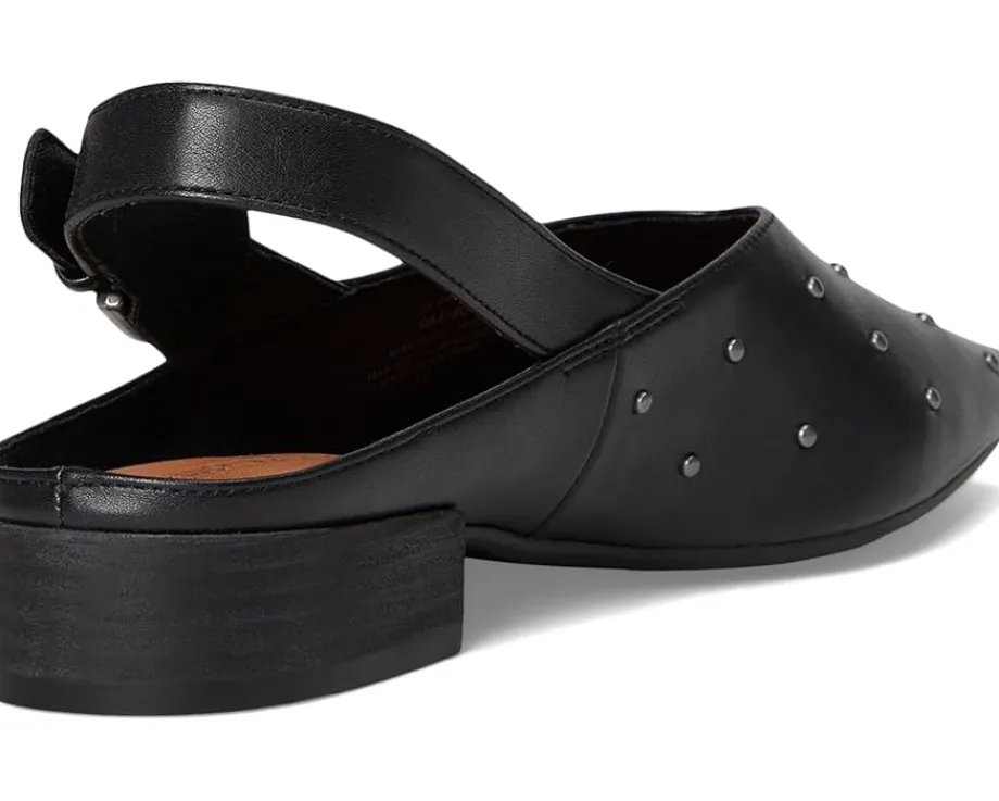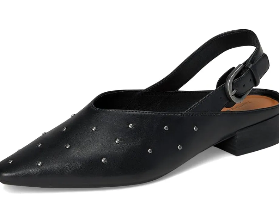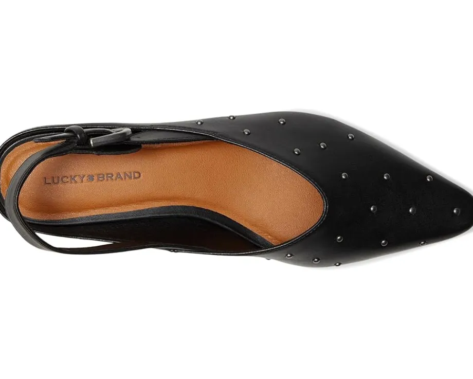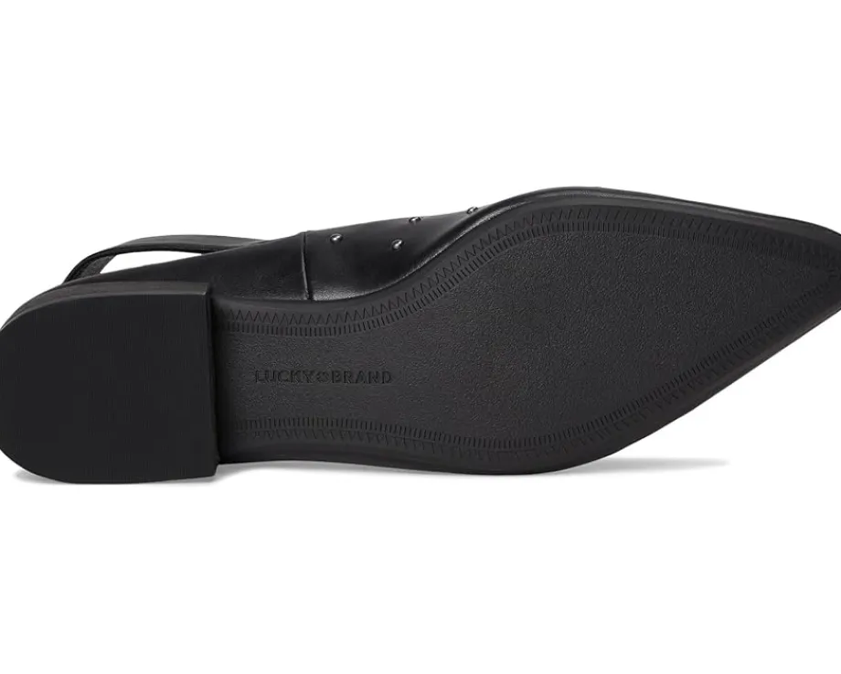 - The Lucky Brand® Brigeet Studded Slingback Mule is a sleek, low block-heel pump that blends edgy detailing with everyday versatility. Crafted with a faux leather upper, it features bold stud embellishments, a snip toe, and a slingback strap with an adjustable buckle closure for a secure, stylish fit. The faux leather lining and rubber outsole offer comfort and traction.
