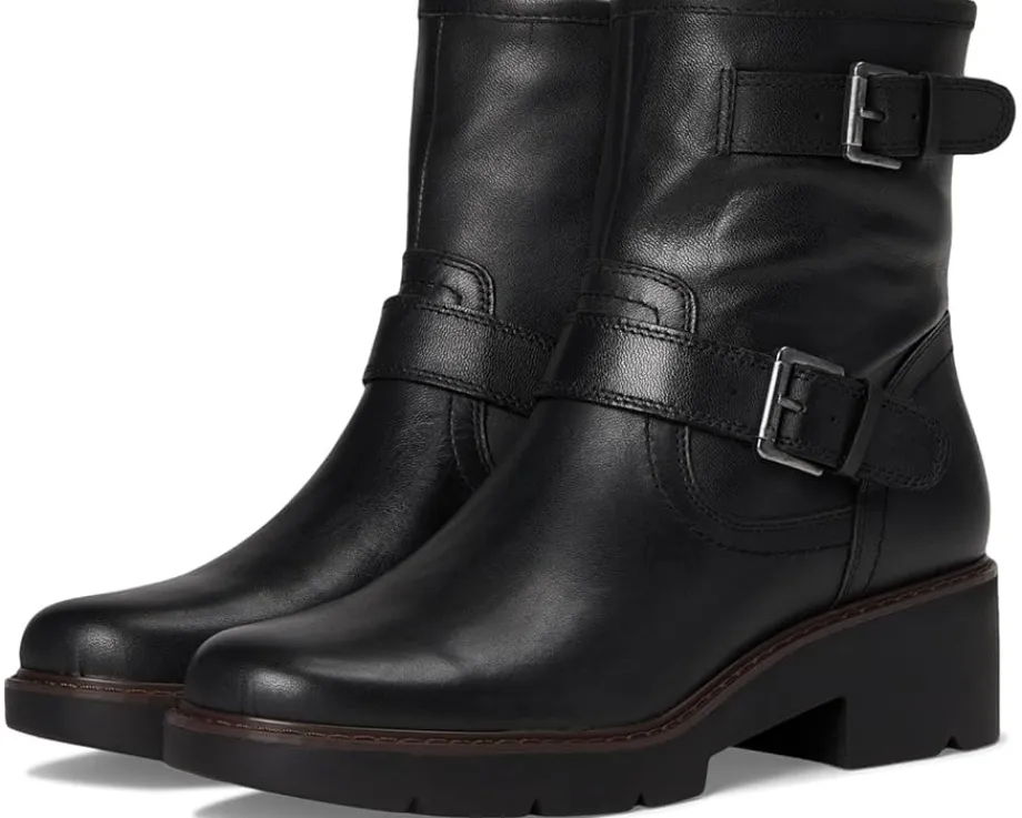- A moto boot classic look in leather! The Lucky Brand® Migyn Double Buckle Moto Boots feature a double buckle detail, rubber outsole, leather upper, chunky block heel and zippered side closure.