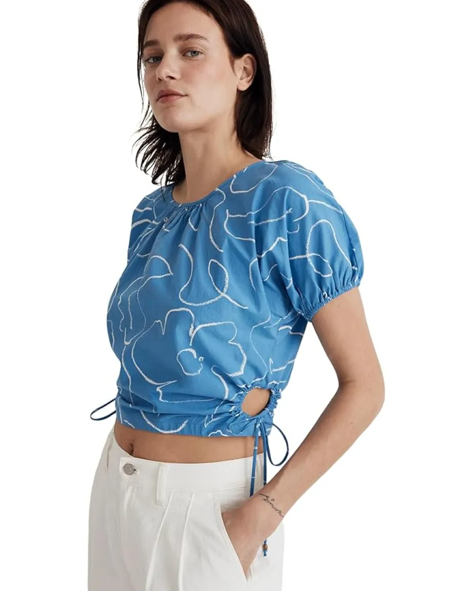 - This Madewell® Jewel Top – Crinkle Poplin is made for casual styling with skirts and trousers. The top has a jewel neck with ruffles, short puffer sleeves, and side ring-tie fastening. It has sketchy prints allover.