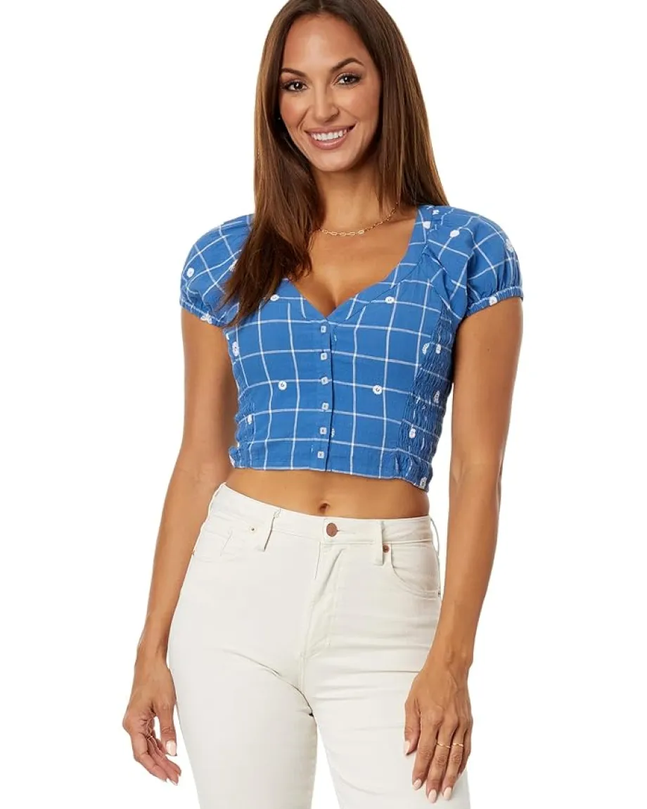 - Slay the day in style wearing the Madewell® Monika Top with Blue Windowpane. This cute cropped-length top features V-neckline, buttoned front closure, and short puffed sleeves that make heads turn.