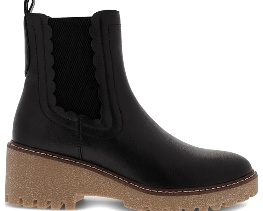 - Step into the KELLEN boot and make your mark with every stride. With its sleek round toe design and a scalloped edge detail, the KELLEN boot combines fashion and functionality. Finished on a elevated 2.3-inch wedged heel.
