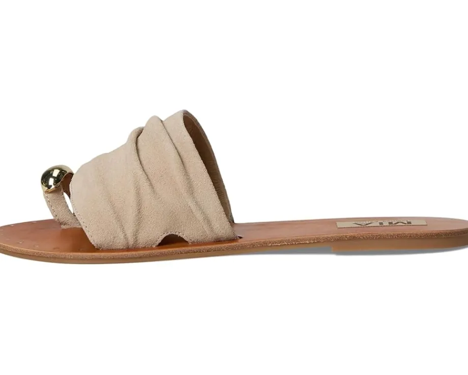 - Liven up your laidback look in the MIA™ MLE-Tiffani sandal. Featuring a genuine suede strap, flexible faux leather lining, nail head details, and a toe ring accent for a touch of glam.