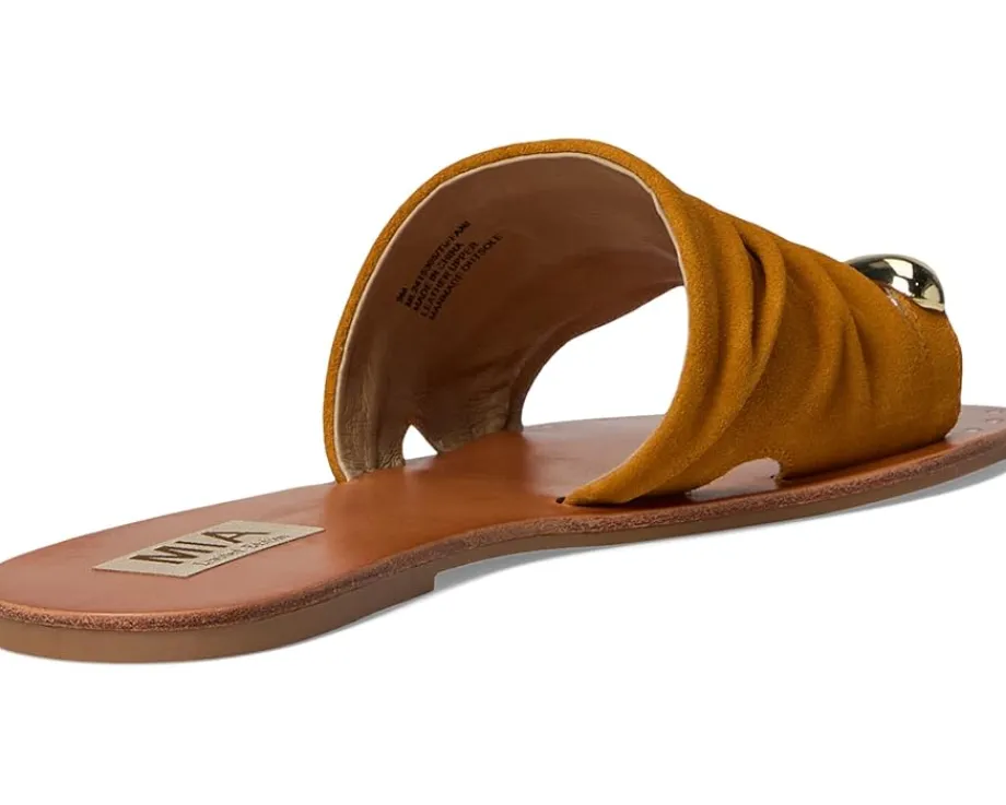 - Liven up your laidback look in the MIA™ MLE-Tiffani sandal. Featuring a genuine suede strap, flexible faux leather lining, nail head details, and a toe ring accent for a touch of glam.