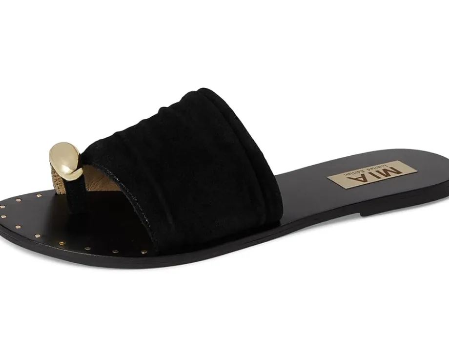 - Liven up your laidback look in the MIA™ MLE-Tiffani sandal. Featuring a genuine suede strap, flexible faux leather lining, nail head details, and a toe ring accent for a touch of glam.