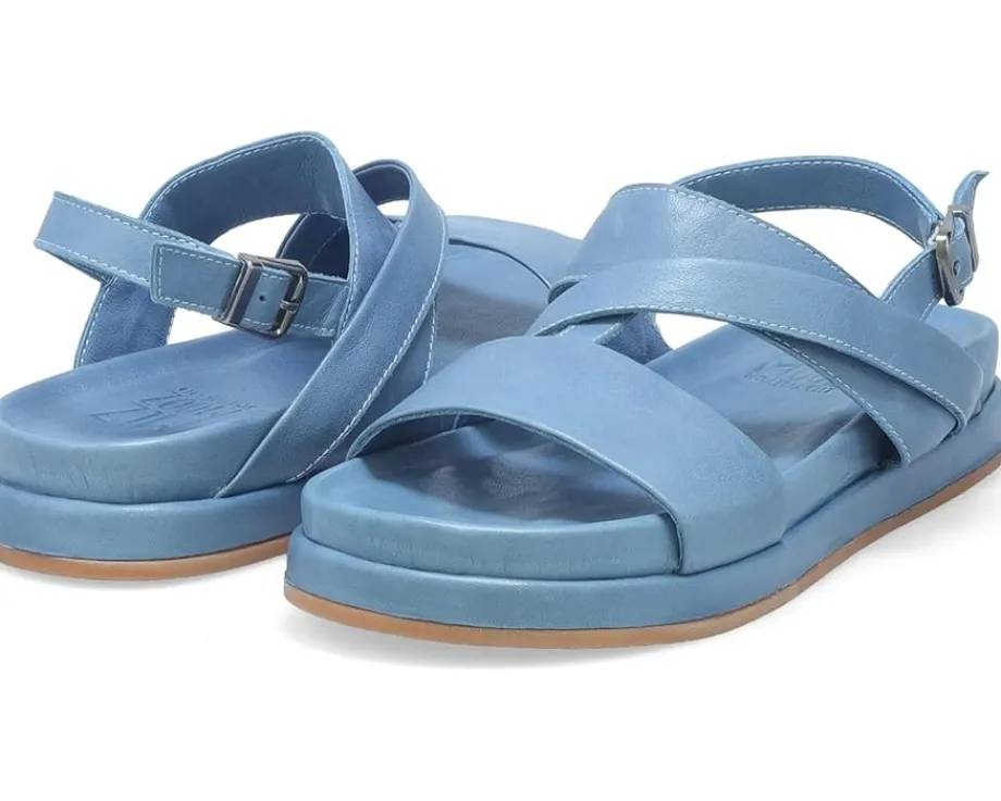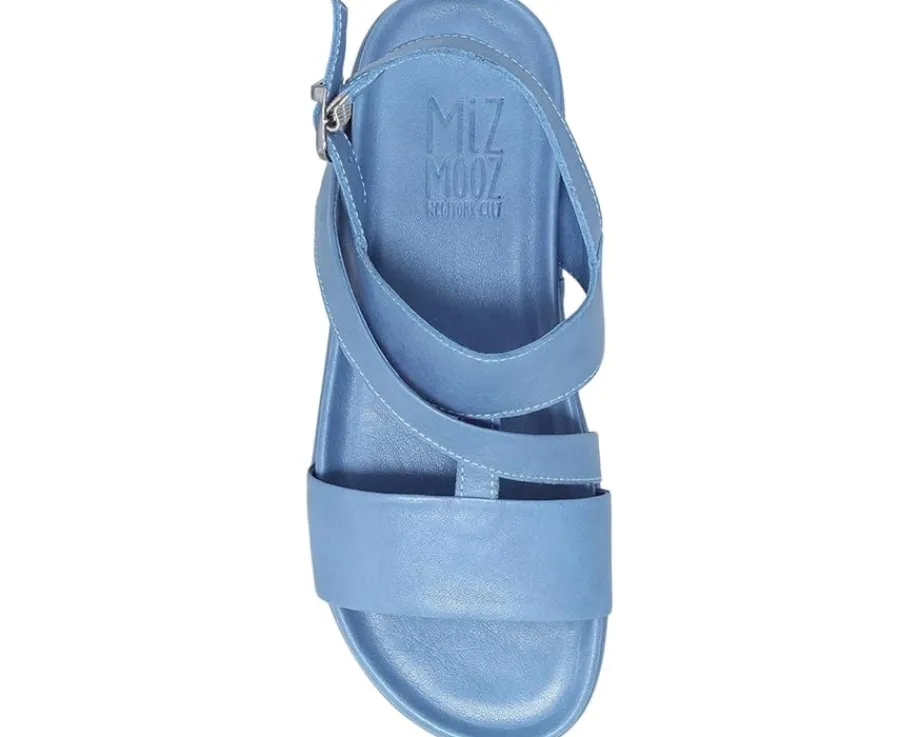 - T-strap design with a thick platform brings a modern twist to the Miz Mooz® Tomas Flat Sandals. The rounded toe footwear features leather upper, lining and insole construction with buckle adjustable slingback strap closure.