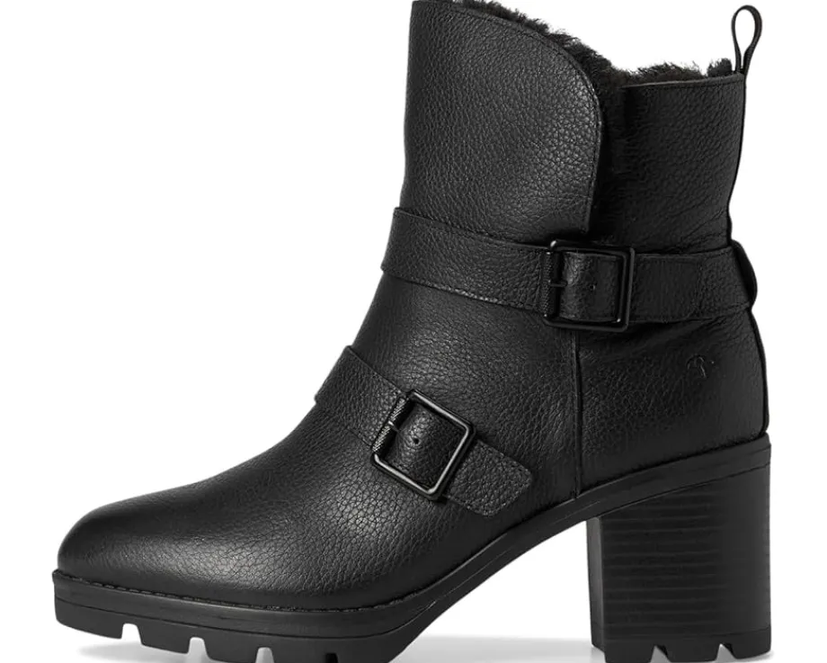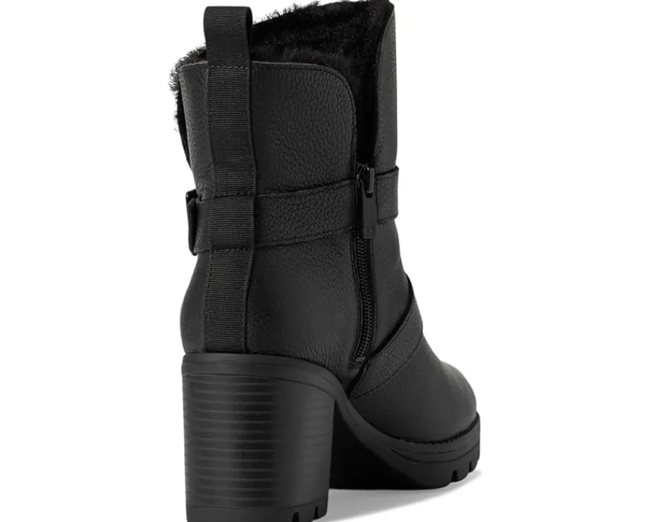 - Water-repellent ankle bootie with a fluffy lining, foldover topline and buckles.