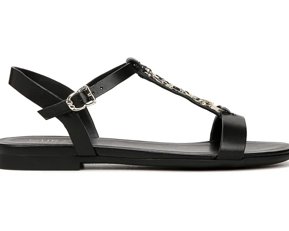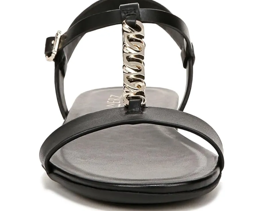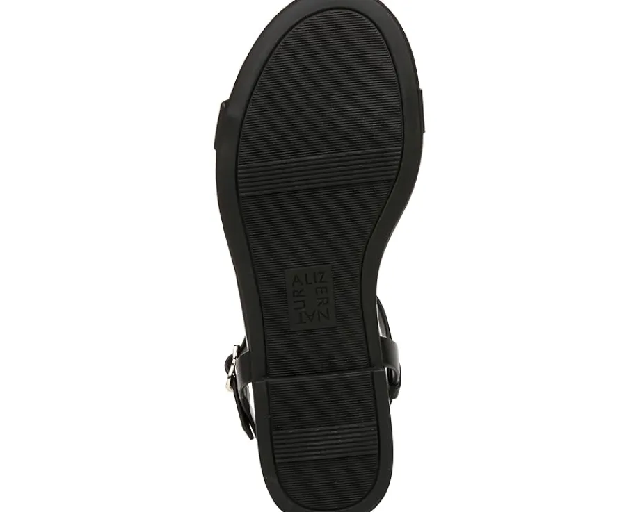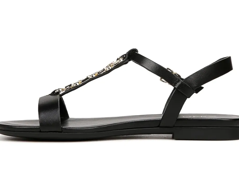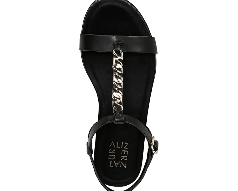 - The Naturalizer® Teach Ankle Straps are designed with Contour+ Comfort technology that offers all-day comfort and a perfect fit. The leather upper of these sandals is styled with a T-strap design and metallic infinity ornament. These flat sandals come with a foam insole and polyurethane lining. Whether you’re getting ready for a casual outing or party, these sandals are a great choice.