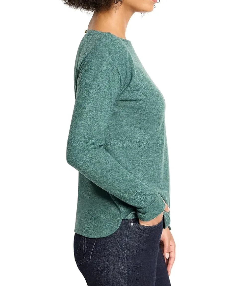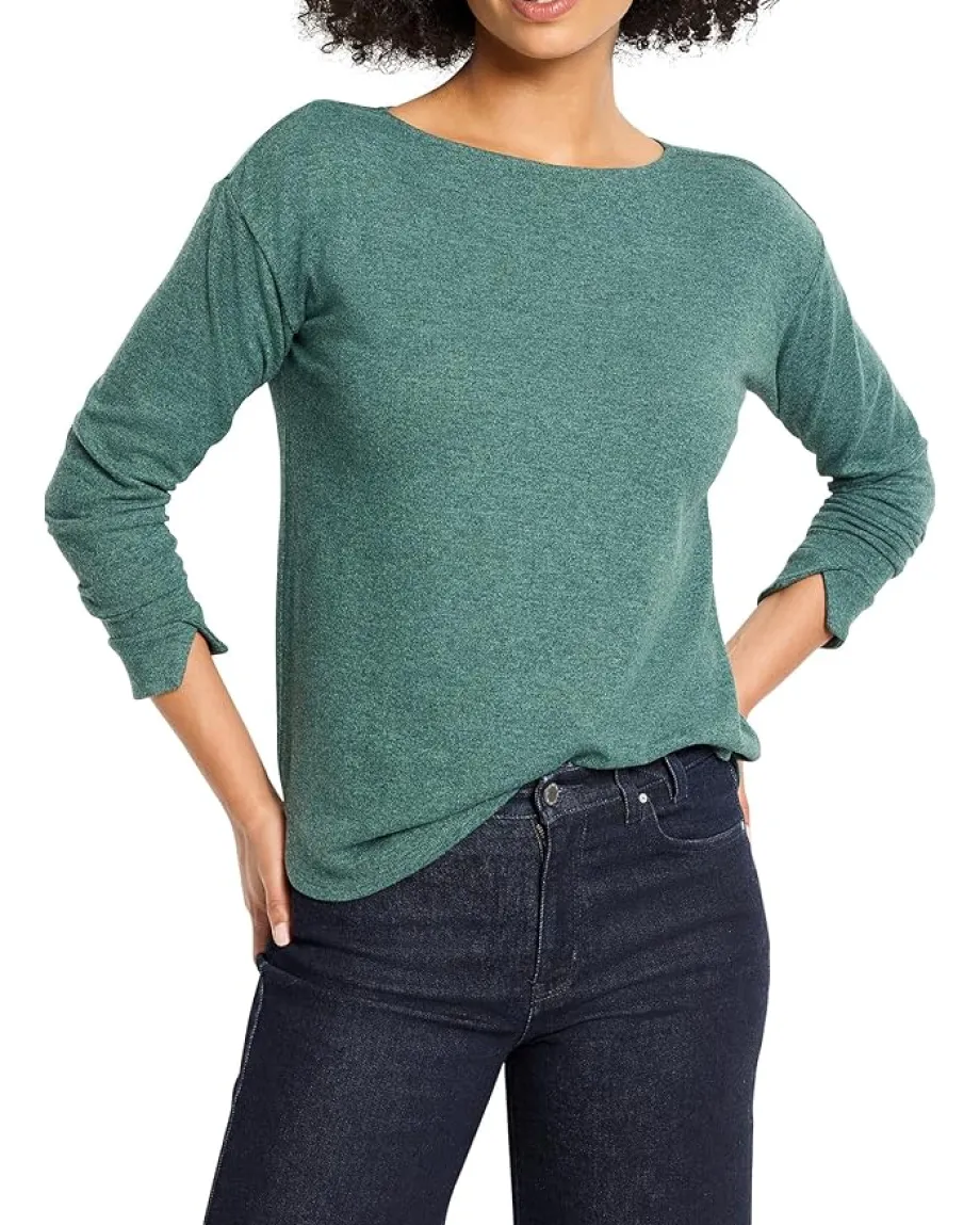 - A relaxed, slightly stretchy tee with the soft feel and gorgeous drape of a blouse: the perfect change-up for your T-shirt rotation. With a cute button closure at the back neck, a relaxed bateau neck, and roomy dropped shoulder silhouette. Pairs perfectly with your favorite jeans.