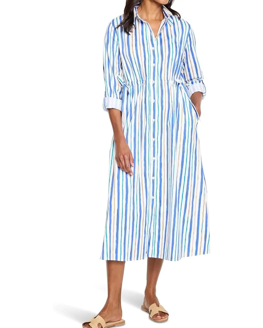- Meet the Oasis Stripe Jamie Dress from NIC+ZOE™. This fresh take on the shirtdress silhouette is crafted from lightweight stretch fabric, blending all-day comfort with effortless movement, ideal for sun-soaked adventures or laid-back brunches. The painted pinstripe offers a contemporary twist on a timeless print, while the button-down front and long sleeves with classic cuffs bring polish and versatility. A self-drawstring at the front waist lets you cinch it just right, and the smocked back subtly flatters your shape. Side seam pockets add casual charm and utility, and the dress falls just below the knee for a touch of sophistication.