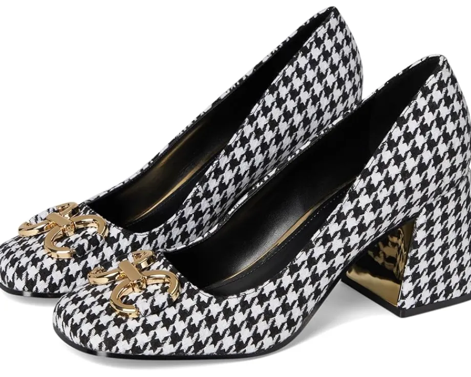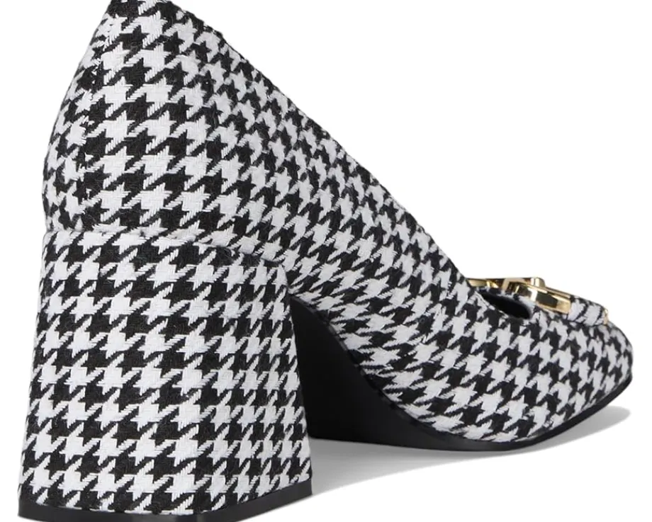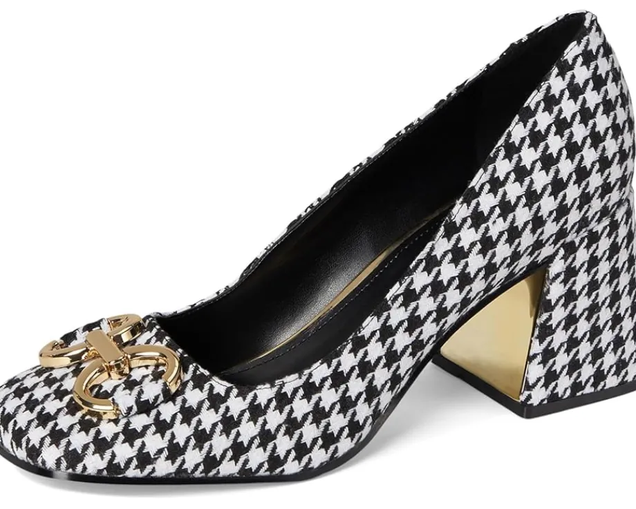 - Upgrade your footwear collection by adding the statement Nine West® Caven heels. The suede leather upper has a statement modern square toe, horsebit detailing on the upper, and a high block heel for an effortless look. The slip-on style pumps have man-made lining and a comfortable footbed that makes them perfect for all-day wear.
