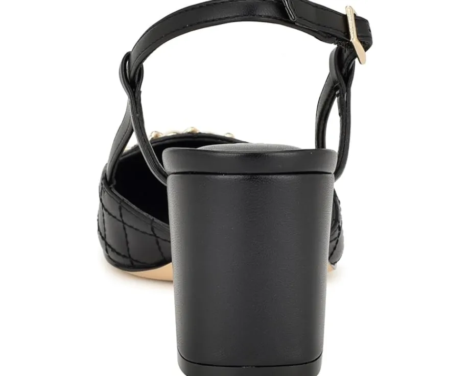 - Get this Nine Wes® Uround footwear to adorn from day to night on special occasions. It has faux leather upper, man-made lining, and comfortable insole. An almond toe in color-blocked design and chain detailing gives it a chic look. The footwear has mid block heel and slingback silhouette with buckle closure that sits perfectly on the ankles.