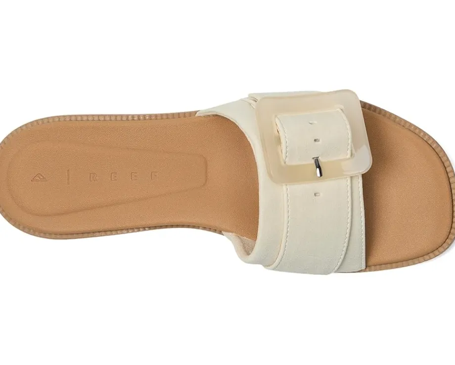 - Say yes to lunch on the patio, you’ve got your sandals picked already. The Reef® Sunny Emma features a chic, fixed buckle detail on a soft and supple vegan leather strap. Crafted from rubber upper, nylon lining, and EVA insole, this pair of sandals features open round toe, topped with compression molded EVA footbed and finished with added insole comfort for cushioned support with every step.