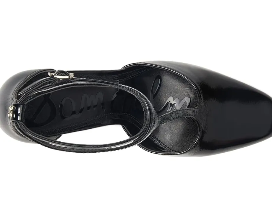 - Raise the glam quotient at the next party wearing the Sam Edelman® Everett Heels. The square-toe heels are crafted with a leather upper, polyurethane lining, and a comfortable faux leather insole. The ankle strap & buckle closure offer easy adjustability and the flare heel elevates the height.