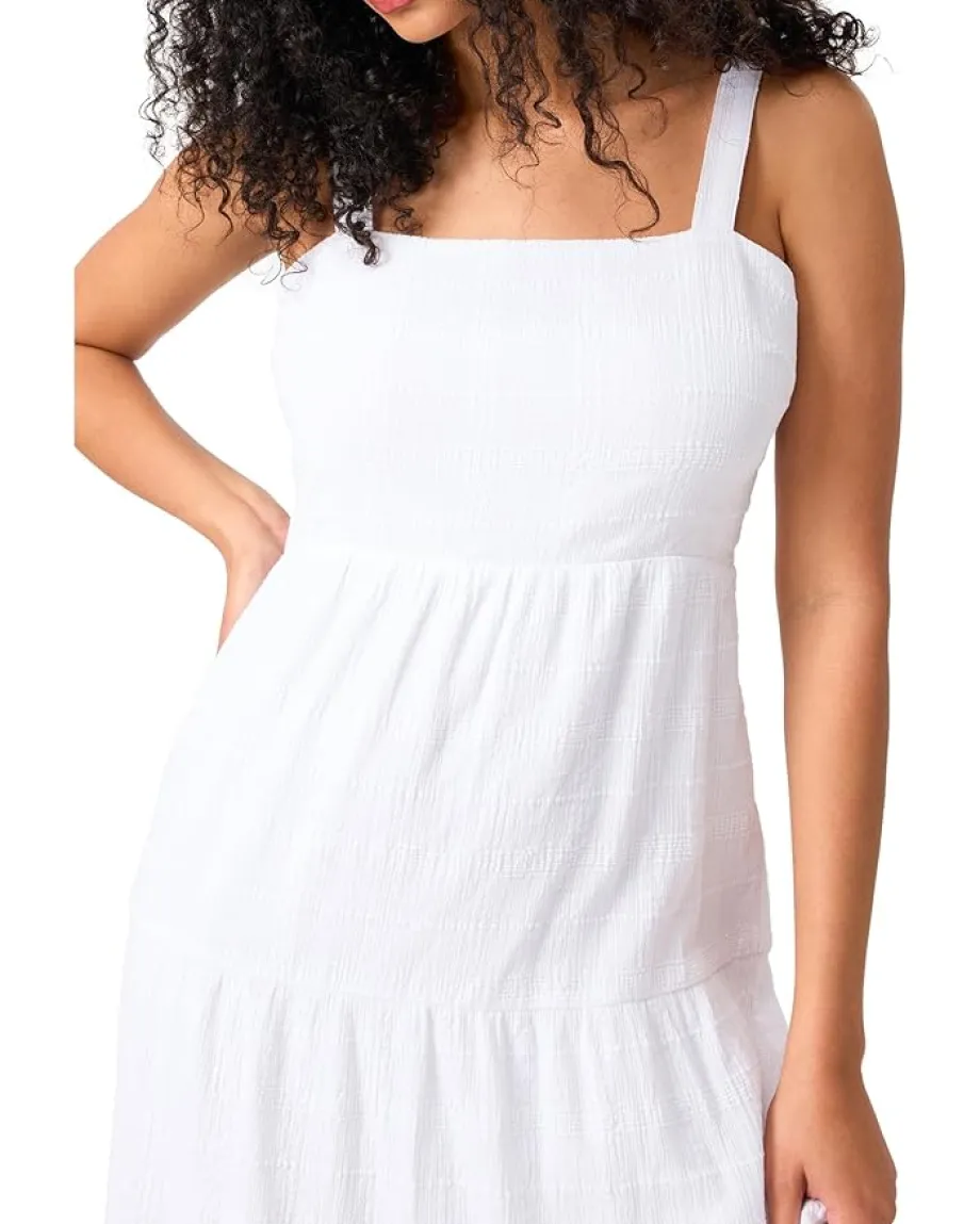 - Exhibit your natural, glossy, and stylish look wearing the Sanctuary® Watching Sunset Tiered Midi. This below-knee-length dress features square neckline, smock detailing on the back, and sleeveless construction.