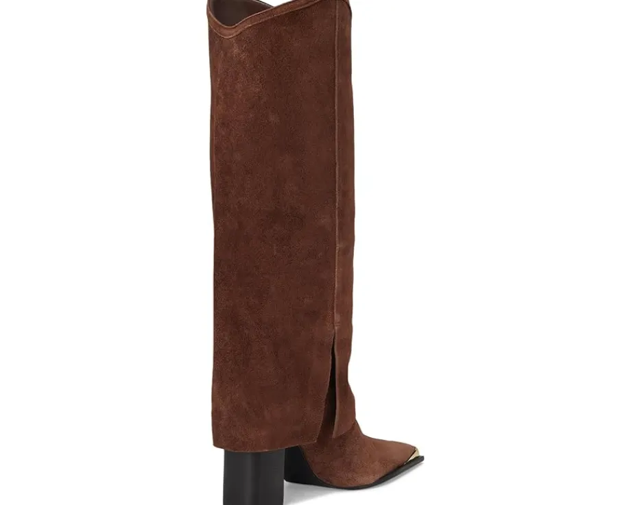 - The Schutz® Raffaela Up Cloak Boot blends texture and subtle shine for a modern take on knee-high boots. Soft suede forms the base, layered cloak detailing adds depth, and the pointed toe design is accented with a polished gold tip. The mid-block heel creates a flattering lift, making this boot a versatile option for elevating both casual and refined looks.