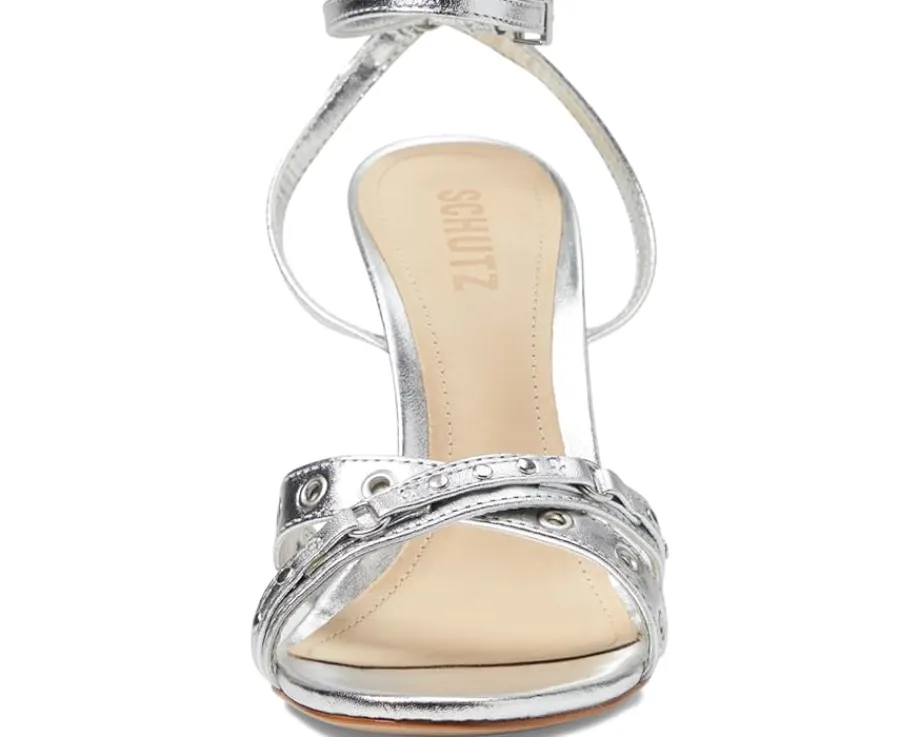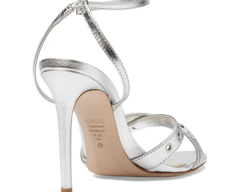 - The Schutz® Patrizia heels are designed to accompany you from dates to dinner parties. A squared open toe and strappy silhouette make it perfectly classy. The leather upper with faux leather lining and lightly cushioned foam insole provide durability with comfort. The heels have an adjustable buckle closure and stiletto heel.
