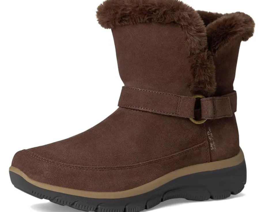- Simply step into the season with effortless cozy comfort wearing SKECHERS® Easy Going – Dreamers Luxe Vibe Hands Free Slip-ins. Designed with the exclusive Heel Pillow™, this boot features a 3M® Scotchgard® treated suede upper with faux fur trim and lining, wrapped buckle detail and a cushioned Skechers Air-cooled Memory Foam® insole.