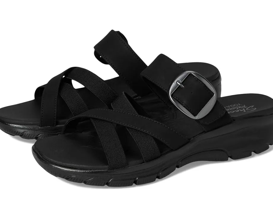 - Head on for explorations in boundless comfort wearing the water-resistant SKECHERS® Easy Going – Perfect Company Sandals. Crafted with vegan materials, the slip-on slides are designed with a double-band knit leather upper, leather lining, and a Yoga Foam® cushioned comfort footbed. The adjustable buckle closure ensures a custom fit.