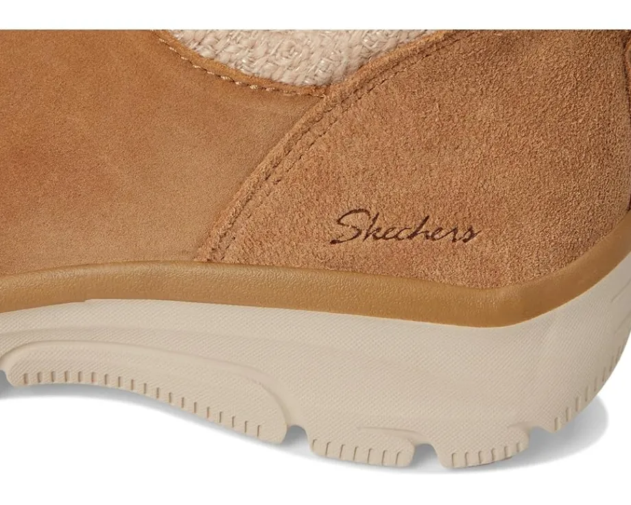 - Get warm comfort and smart, versatile style instantly choosing the SKECHERS® Easy Going – Sweet Behavior. Soft suede upper in a low ankle-height slip-on casual cool weather bootie with chenille collar trim and Skechers Air-Cooled Memory Foam® cushioned comfort insole. It has a bootie design with cutaway sides for flexible, easy-wearing comfort.