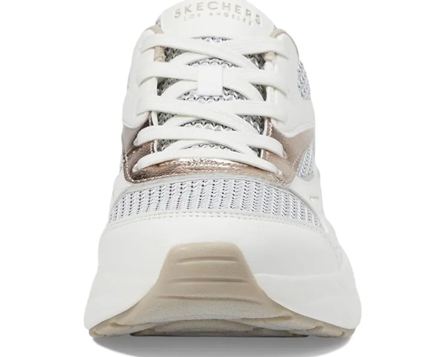 - Add a sporty and casual touch to your look with the SKECHERS® Hazel – Metallic Soiree SNeakers. Designed with a polyurethane upper, polyester lining, and Skechers Air-Cooled Memory Foam comfort insole, these sneakers are versatile and trendy. The round toe shoes come with a lace-up closure for a secure fit.