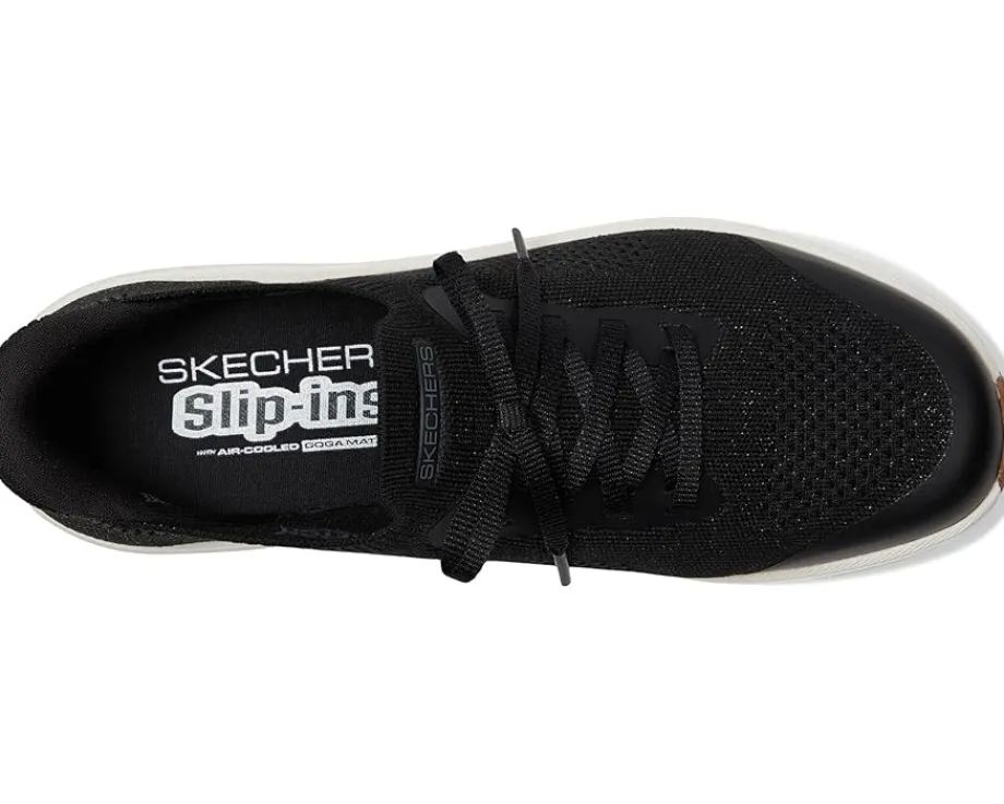 - Style it sporty or street-chic, On-the-go Hands Free Slip-ins Max Cushioning Lite Aura – Quinn by SKECHERS® Performance brings the glow to wherever you go. Designed with an easy pull-on style and fixed laces, this sneaker features the exclusive Hands Free Slip-ins™ with a secure Heel Pillow™ that hugs your heel for a snug, no-fuss fit. The breathable metallic knit upper pairs perfectly with our ULTRA GO® midsole for high-rebound, responsive comfort. Featuring a lightweight EVA insole and outsole and a lower-profile Max Cushioning Lite Aura design, these sneakers deliver athletic performance with sleek, casual style.