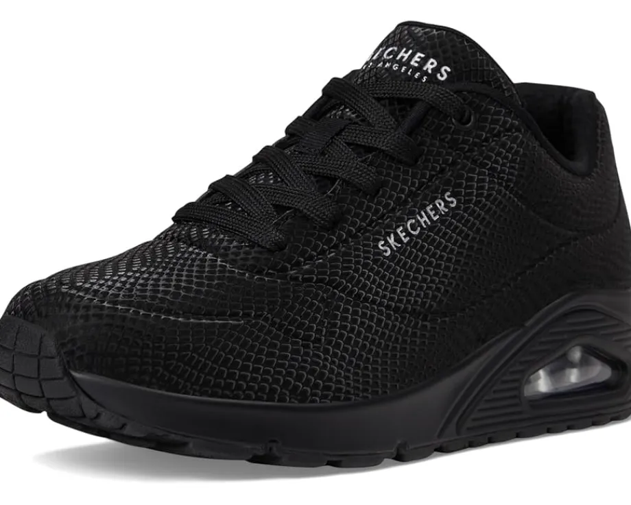 - Step into the groove with the SKECHERS® Uno – Shiny Scale shoes. These fashion sneakers feature a lace-up polyurethane reflective upper, Skechers Air-cooled Memory Foam® insole, and a visible, air-infused Skech-Air midsole that gives you the feeling of walking on clouds, everywhere you go. The polyester lining offers added comfort. Experience cushioning and exceptional support with their signature comfort technology. Take to the air in a variety of lightweight styles and comfortable cushioning you can feel with these lace-up sneakers.