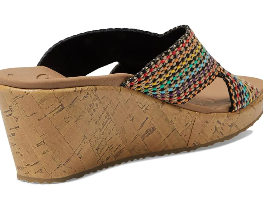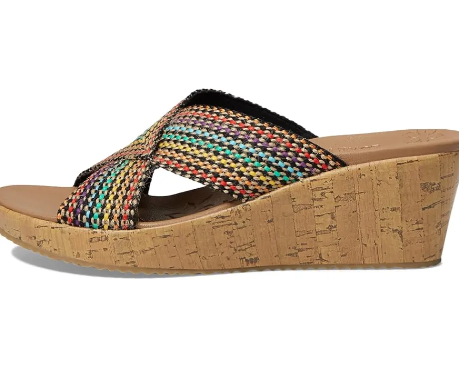 - The SKECHERS® Beverlee – Delighted sandal will add style and comfort to any ensemble with a woven natural fiber upper, an open toe, and crisscrossing vamp straps with a woven finish.