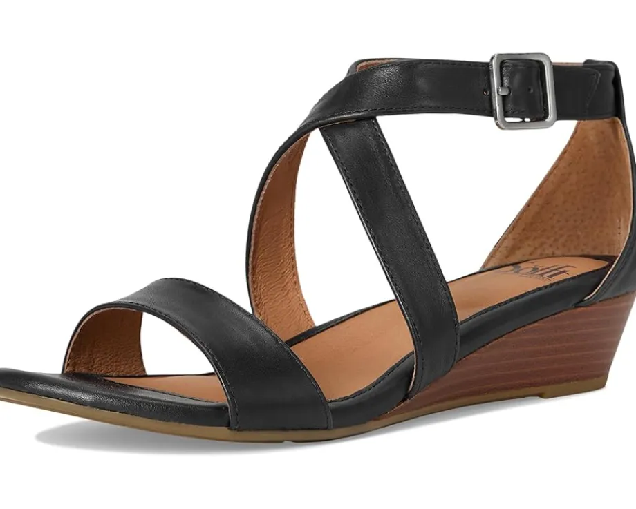 - Strappy suede or patent uppers in a sandal wedge silhouette.