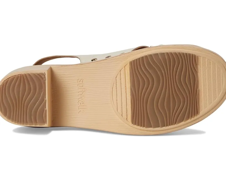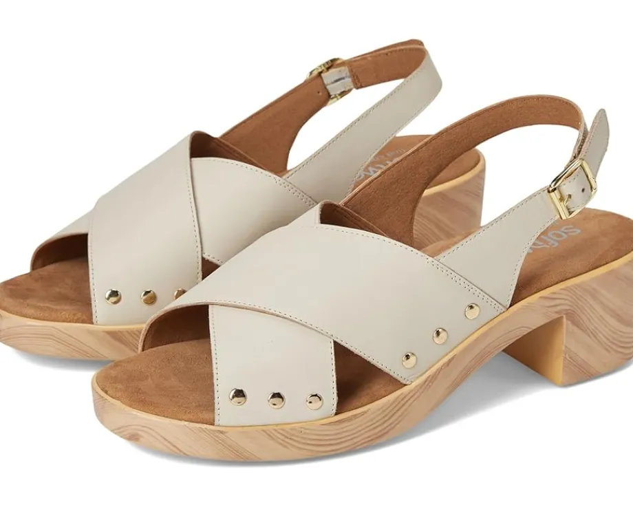 - Embrace the ease wearing the SoftWalk® Florence. Crafted from microfiber upper, leather lining, and footbed, this pair of sandals features open round toe, clog sole with a cross strap sling design that is adorned with chic stud details. The sole has the look of a wooden clog but is actually a lightweight polyurethane sole with rubber insert on the outsole for sure footing. The cushioned footbed is lined in soft suede leather and has arch support.