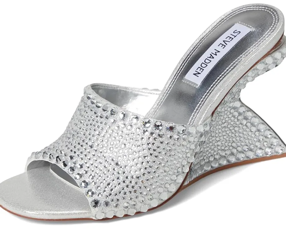 - The Steve Madden® Krash-R wedges are a stunning fusion of modern and traditional elements. The foil fabric adds a shimmering metallic sheen, while the rhinestone embellishments elevate the design to a whole new level. The comfortable wedge heel provides a boost of height without sacrificing stability, making these sandals perfect for both casual and formal occasions. The combination of foil and rhinestones creates a truly glamorous and eye-catching footwear piece.