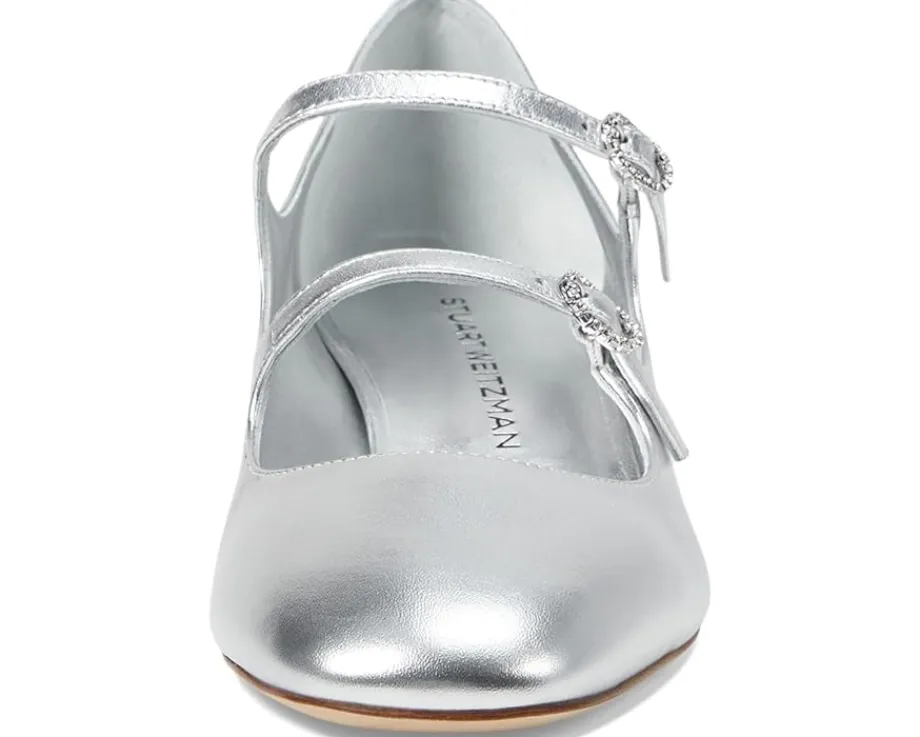 - Make a lasting impression donning Stuart Weitzman® Claris Mj 35 Pump! Featuring a chic round toe and trendy dual buckle closure, this shoe combines style with supreme comfort. The mestizo leather lining and EVA insole provide a luxurious feel, while the patent PU-coated calf leather upper ensures durability and shine. The cow leather outsole offers unmatched stability.
