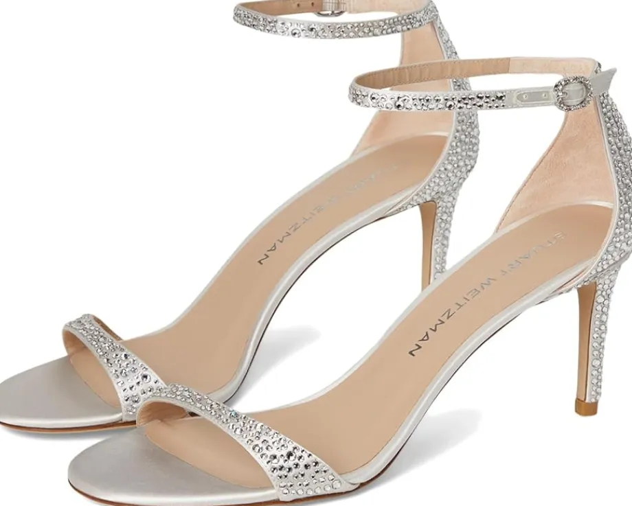 - Shine brighter, walk taller, and let every stride be your statement in unparalleled luxury styling Stuart Weitzman® Nudist Shine 75. Featuring a luxurious silk upper and a slender stiletto heel, the Nudist Shine 75 promises both glamor and grace. The adjustable buckle ankle strap ensures a secure fit, while the open-toe design showcases your pedicure with elegance. With a leather lining, insole, and outsole, every step feels as refined as it looks.