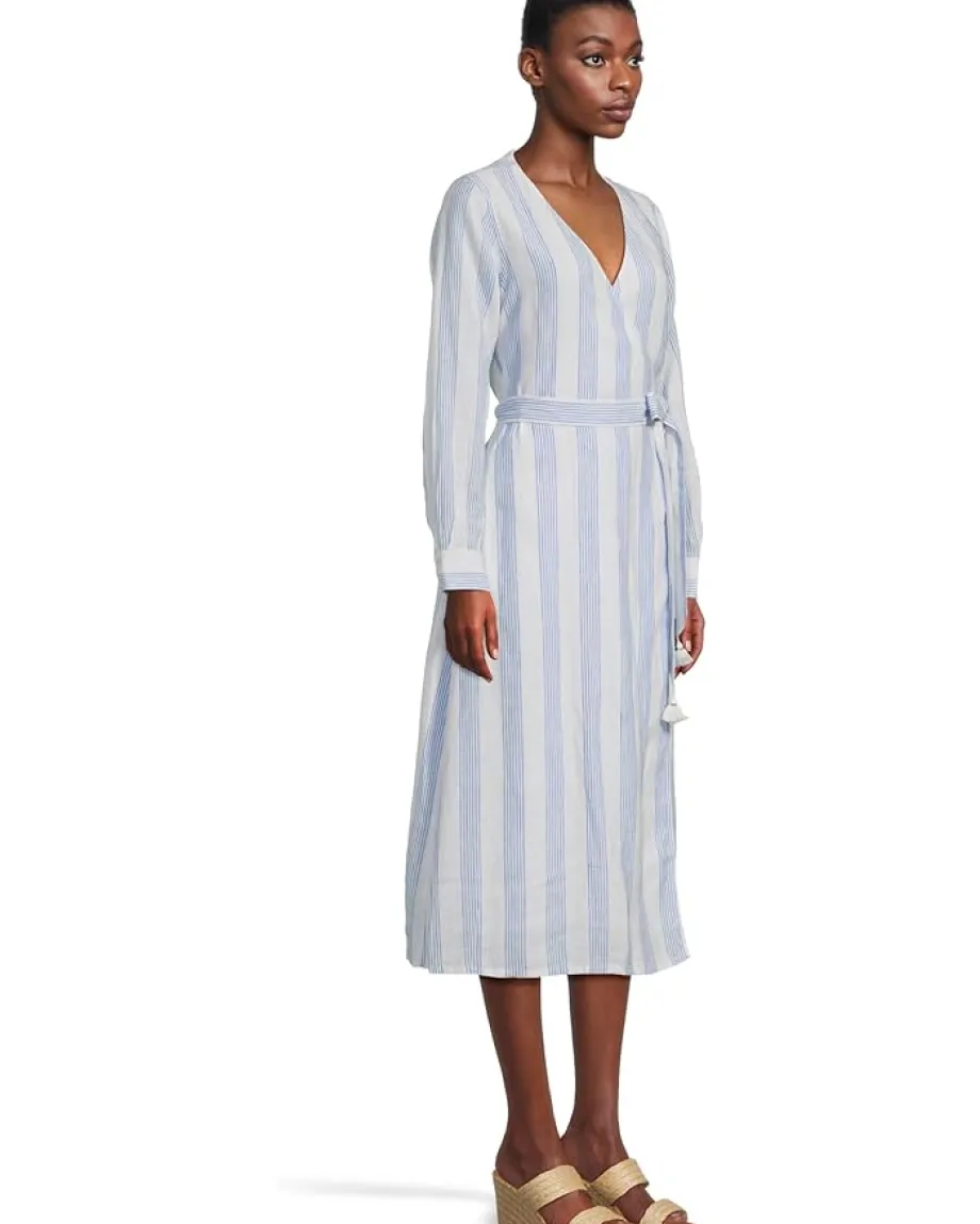 - Make weekend getaways more fun and stylish donning the Tommy Bahama® Bayside Isle Wrap Dress. The pull-on style dress features a V-neckline, long sleeves with barrel cuffs, an adjustable belt at the waist, and a wrap-style silhouette. It features a timeless striped print allover, two slit pocket for added functionality, and a sophisticated below-the-knee silhouette.