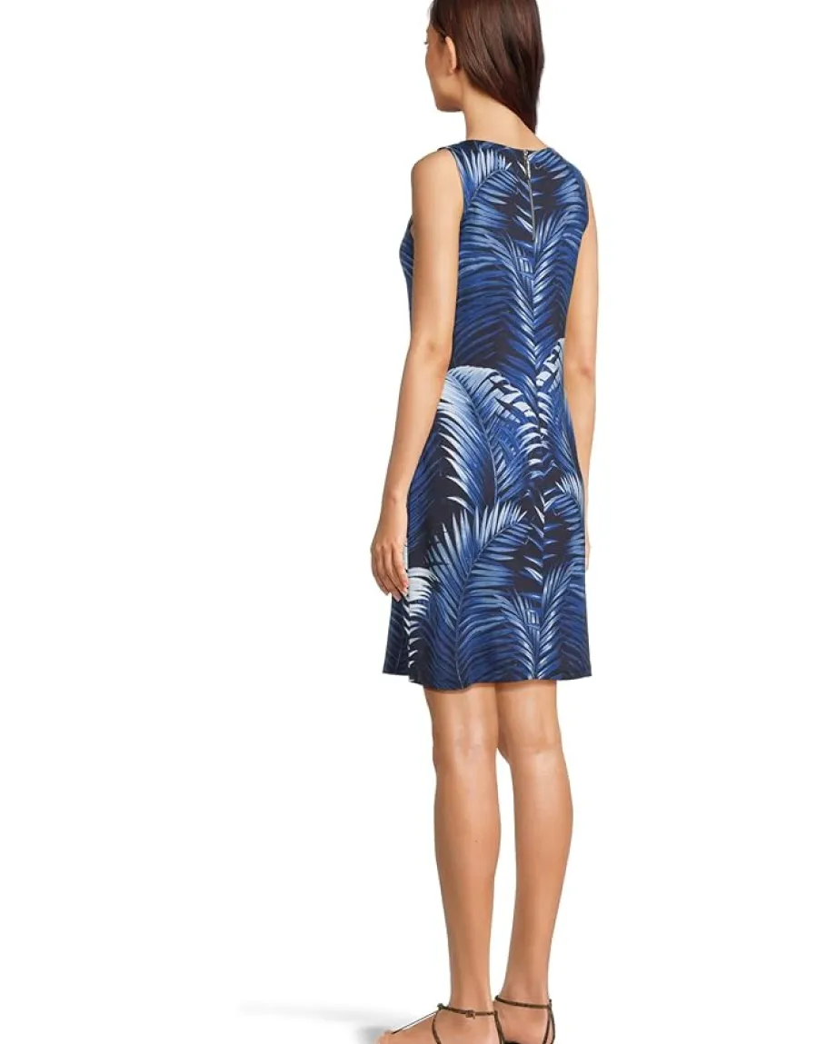 - The Tommy Bahama® Darcy Leaf Of Luxury Sleeveless Dress is a printed sheath dress in a vibrant blue frond design, with a hint of stretch. Its UPF 30 protection blocks out sun rays while the wrinkle-resistant Ponte fabric provides a streamlined structure and comfortable stretch. The zippered back closure offers easy wear. This sleeveless dress is designed with a round neckline and a straight hem.