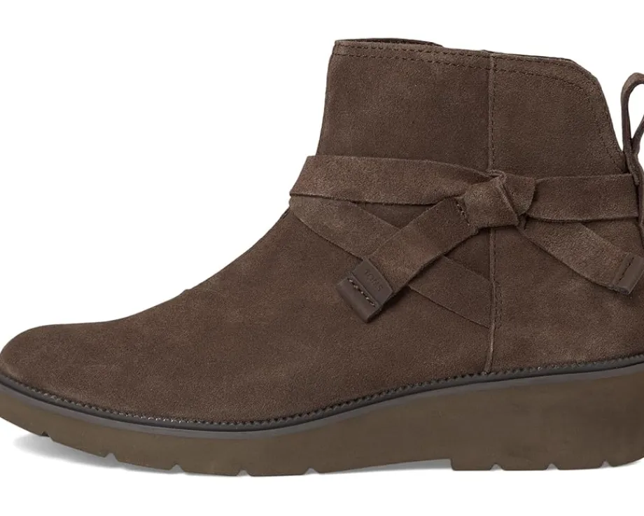 - Find the perfect addition to your fall weather wardrobe in the TOMS® Marlow booties. Featuring a suede upper, polyester lining, polyurethane insole, a medial zipper and pull tab for easy on and off, and a decorative wrap around strap with a low wedge heel.