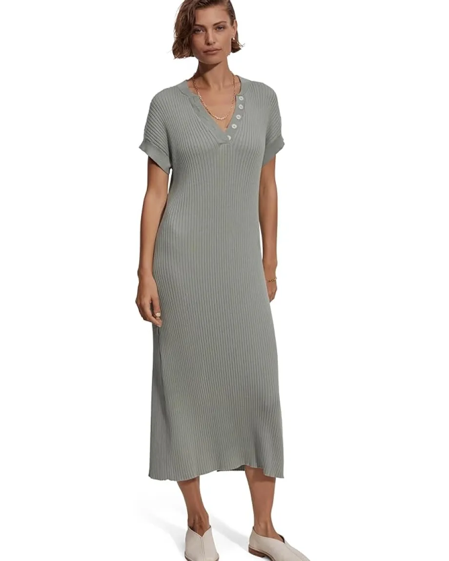 - Crafted from a ribbed knit fabric that offers a flattering fit, the Varley® Aria Knit Midi Dress is perfect for parties and casual wear. The short sleeves and buttoned neck offer style and functionality. This ribbed midi dress features a long slit at the back for a chic look. Make your fashion statement by wearing this fitted dress.