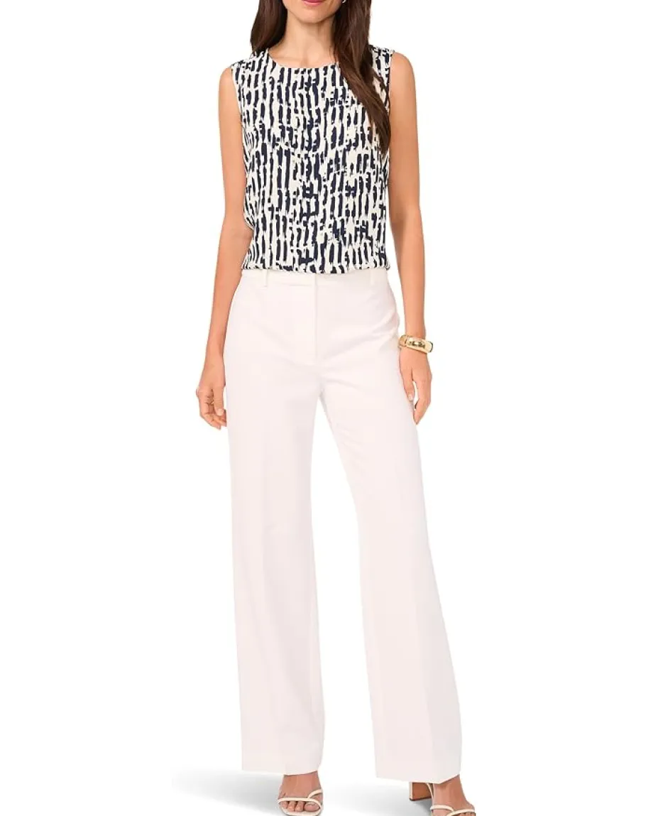 - Be it a casual outing or a formal event, the Vince Camuto® Crew Neck Tank Blouse offers an effortless style along with versatility. The crew neckline and sleeveless silhouette complement an allover print design with a fishhook and button closure on the back.