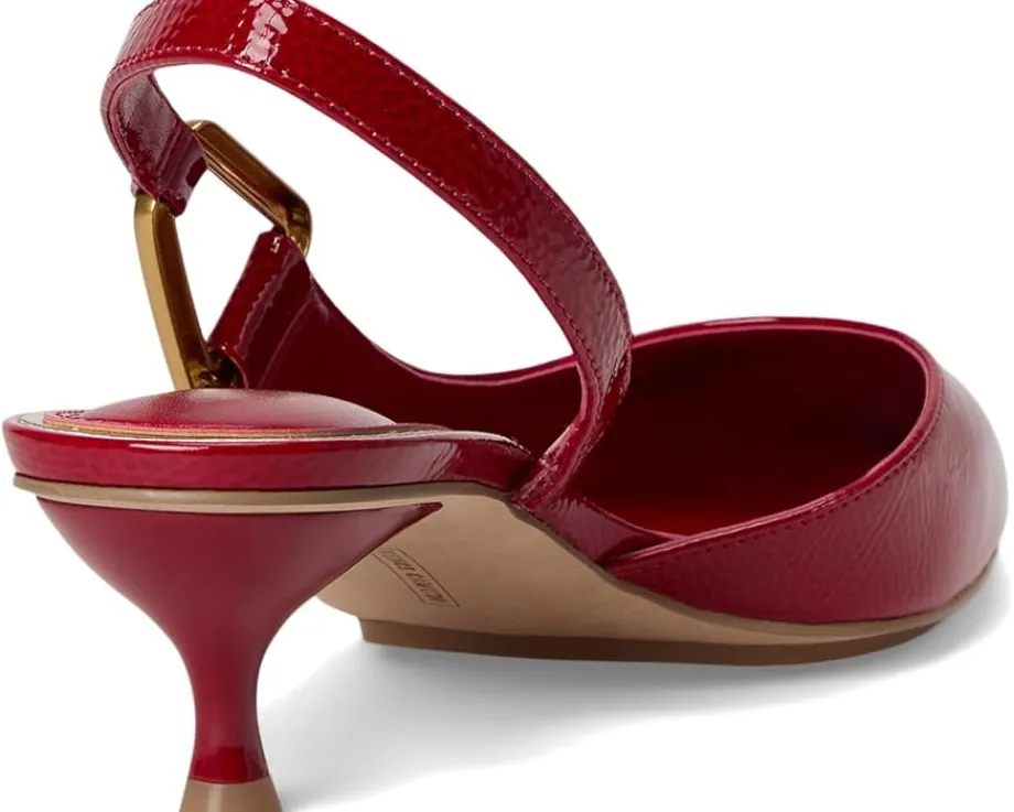 - The Vince Camuto® Inari Lasso Buckle Slingback Pumps feature a glossy naplack finish that radiates confidence and sophistication. Their sleek, pointed toe shape elongates the leg, while the delicate kitten heels offer a perfect balance of elegance and comfort. A gold-tone geometric accent on the slingback strap adds a modern touch, enhancing its chic appeal. These heeled pumps are made of a leather upper, rubber insole, and polyester lining. Ideal for both day and evening wear, the versatile design of these slingback pumps effortlessly transitions from office attire to special occasions, making them a must-have statement piece in any wardrobe.