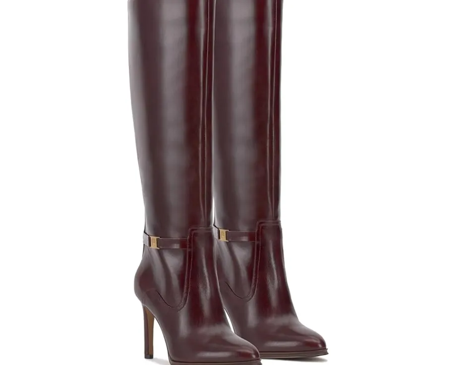 - Walk with sleek poise wearing the Vince Camuto® Skylie Boots. The knee-high footwear embodies heritage with leather upper and logo hardware on the ankle belt. This riding boot inspired style is taken up a notch by its covered, stiletto heel. This classic is constructed with an almond toe, micro platform, and inside zip for easy entry.