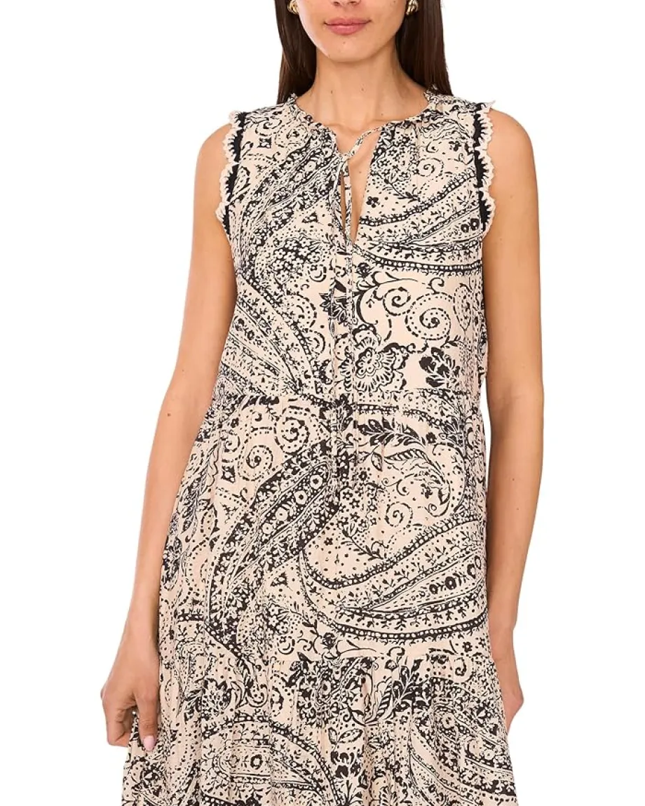 - Head to your next brunch in chic style in the Vince Camuto® Sleeveless Crochet Trim Tiered Maxi dress. Featuring a V-neckline with ties, sleeveless design, allover print, and a maxi length.