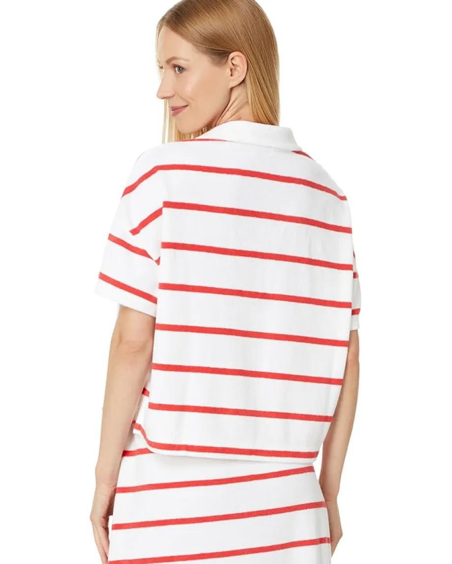 - Give your classic style a boost! The vineyard vines® Terry Towel Relaxed Polo offers a V-neckline, short sleeves, dropped shoulders, stripe detailing throughout, and side slits at the hem.